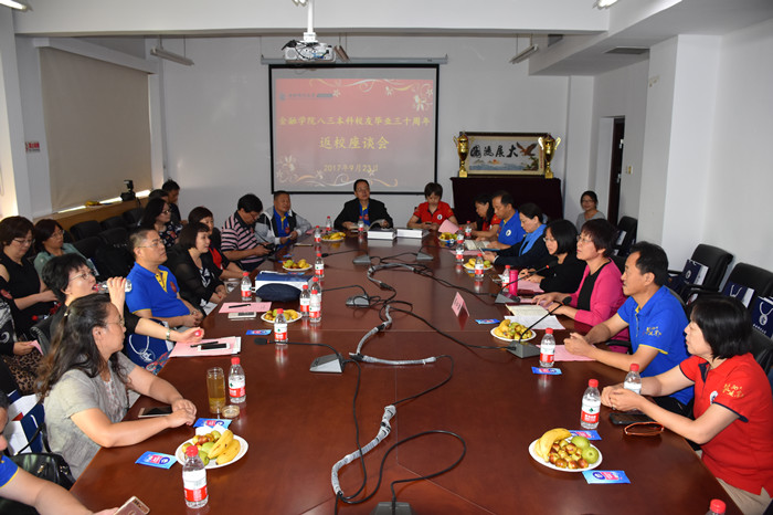 2017年9月23日上午,我院八三本科校友毕业三十周年值年返校座谈会在学院南路校区主教913会议室顺利举行。学院党委书记葛仁霞,学生工作办公室主任王志梅,职业发展中心位锦与从世界各地归来的46名校友欢聚学院,回忆美好的青春年华,畅谈浓浓的师生情谊。北京语言大学党委书记、八三金融班倪海东校友主持了此次座谈会。