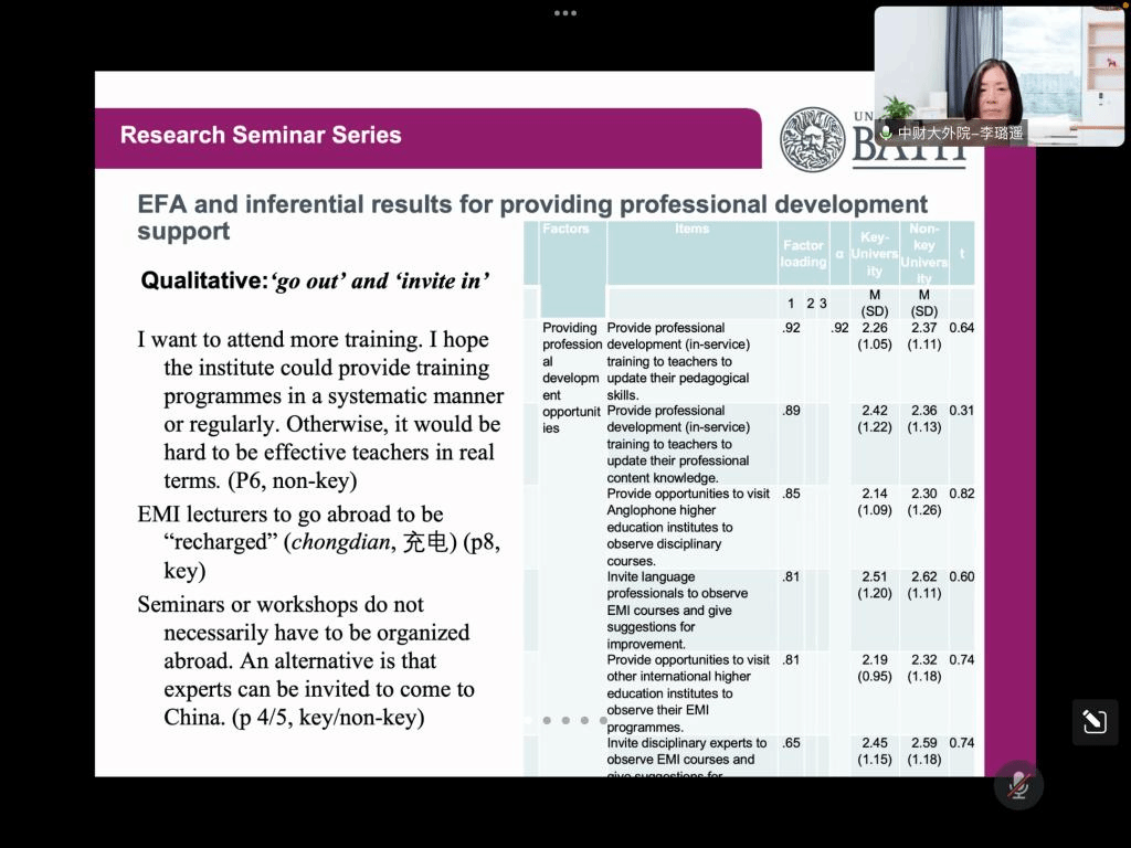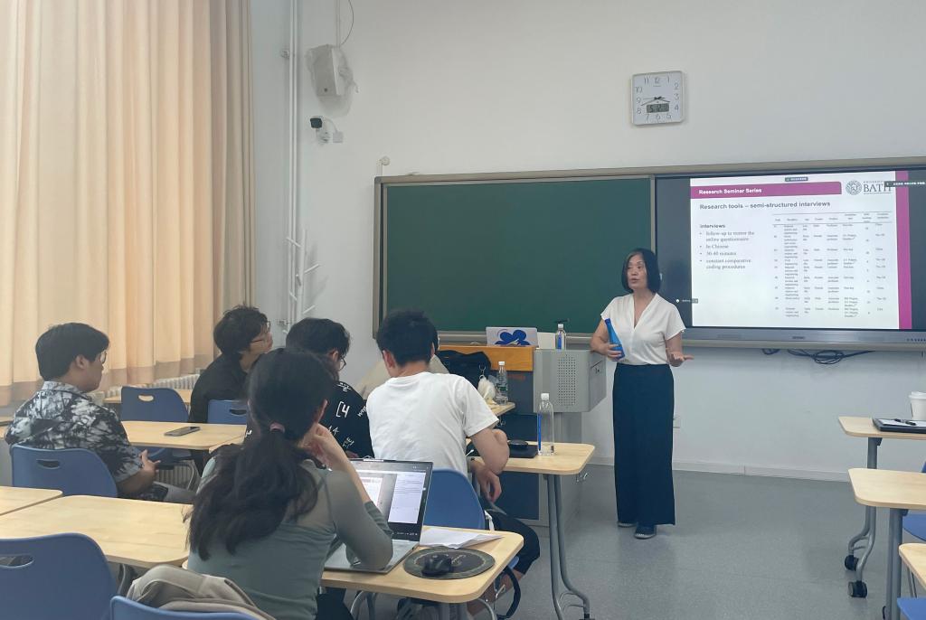 张教授以巴斯城市及巴斯大学的优美环境为开场,讲述校园趣事。随后,张教授分享了她有关EMI的实证研究:从教师视角出发,探讨国内EMI课程落实的难点和痛点,以及相关教师所面临的困境和需要的制度支持。