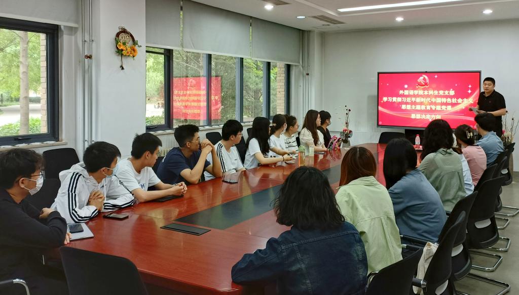 根据院校两级关于深入开展学习贯彻习近平新时代中国特色社会主义思想主题教育实施方案的工作要求,进一步深入学习贯彻落实党的二十大精神,按照学思想、强党性、重实践、建新功的总体要求,着力提高理论学习水平、政治大局素养和能力本领,5月17日下午,外国语学院本科生党支部书记宋一民结合自身学习收获,以“切实提高政治站位 财经报国初心不忘”为题,在沙河校区学院4号楼114会议室为本科生党员讲授学习贯彻习近平新时代中国特色社会主义思想主题教育专题党课。