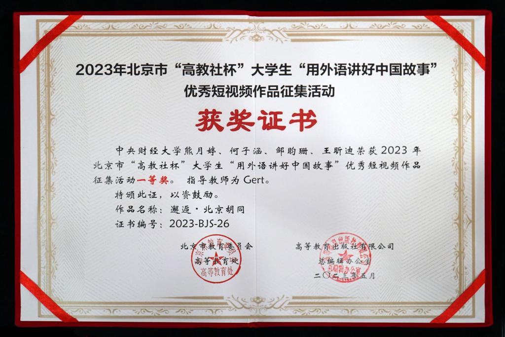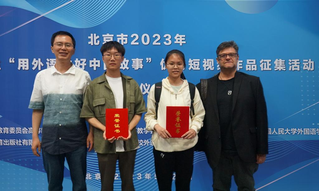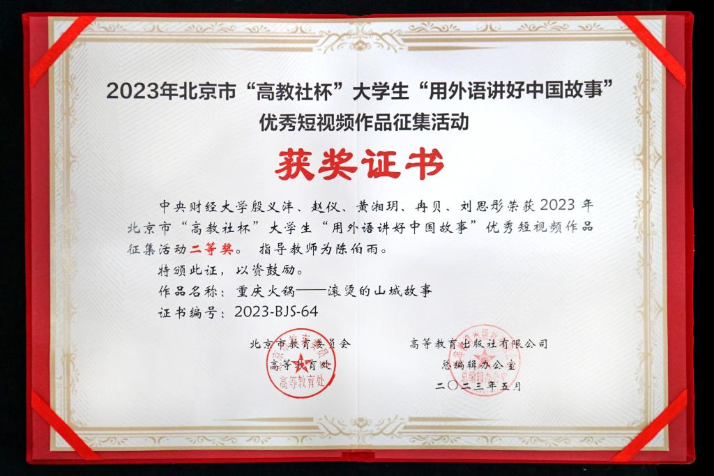 北京市2023年大学生“用外语讲好中国故事”优秀短视频作品征集活动于4月进行校级评审,5月开展北京市级遴选。本次优秀短视频作品征集活动以“大美中国,故乡风韵”为主题,我校选送的短视频作品 《邂逅·北京胡同》(作者:熊月婷等)在北京市级遴选中荣获一等奖;《重庆火锅——滚烫的山城故事》(作者:殷义沣等)在北京市级遴选中荣获二等奖。
