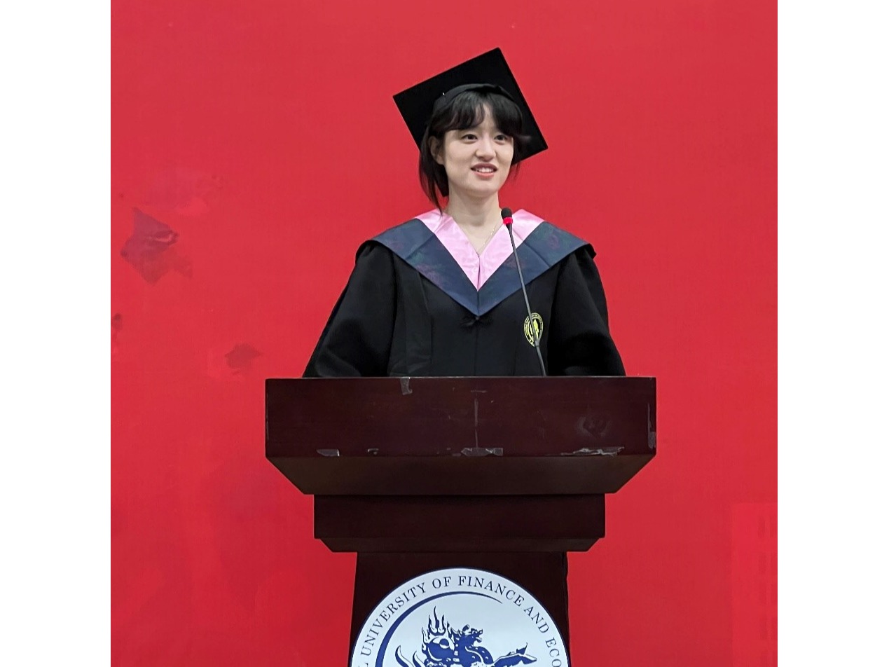 随后,来自财经英语19级的丁泽越同学代表学院全体毕业生发言。她回顾了过去四年大学生活的点点滴滴,怀念青葱岁月,感念母校培养。她呼吁,毕业生们要勇于担当,学贯中西,砥砺前行。发言最后,丁泽越同学表达了对母校、师长和同学们的衷心祝愿。