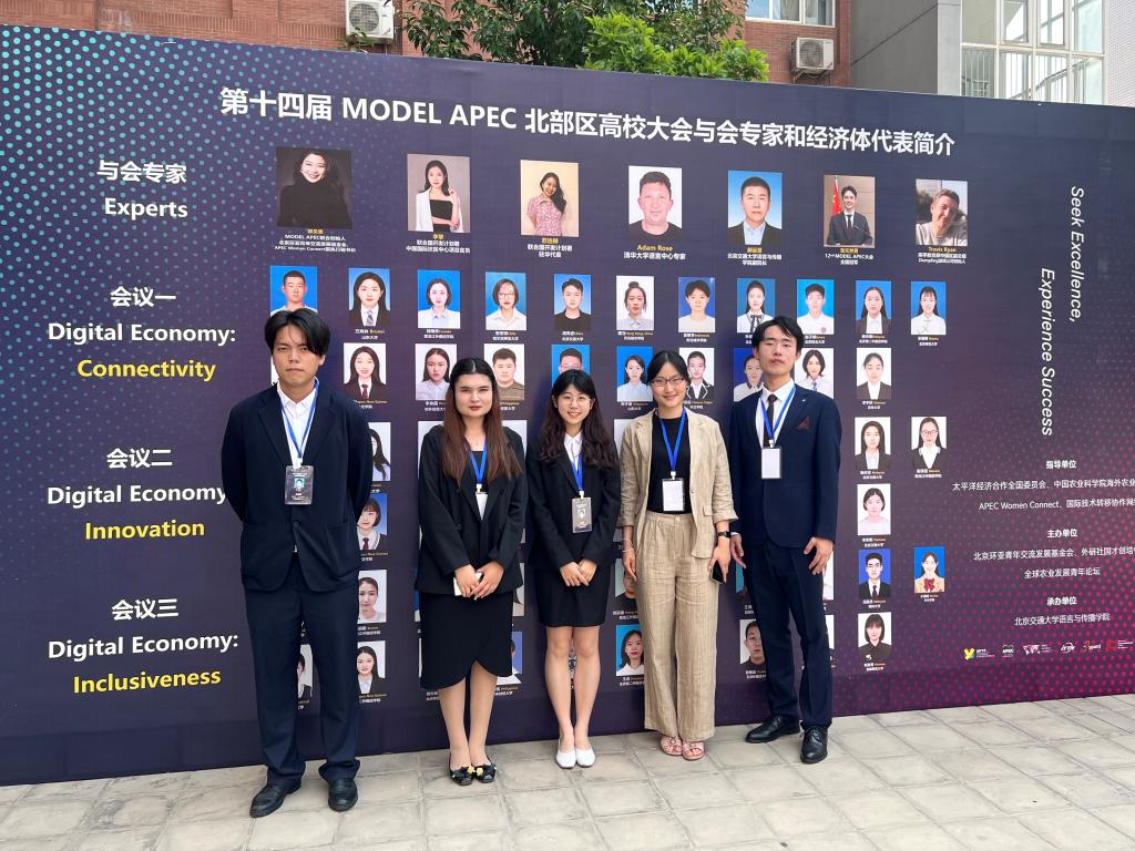 2023年7月2日,由太平洋经济合作全国委员会和APEC Women Connect指导,北京市环亚青年交流发展基金会、亚太青年模拟APEC大会组委会主办的第十四届MODEL APEC大会北部地区会议在北京交通大学顺利举办。此次比赛,我校派出王星翰(金融学院2022级)、缪如萱(国际经济与贸易学院2021级)、叶恬甜(统计与数学学院2022级)、王毅伟(管理与工程学院2022级)、艾克达木·阿布来提(文化与传媒学院2022级),5名同学参加比赛。