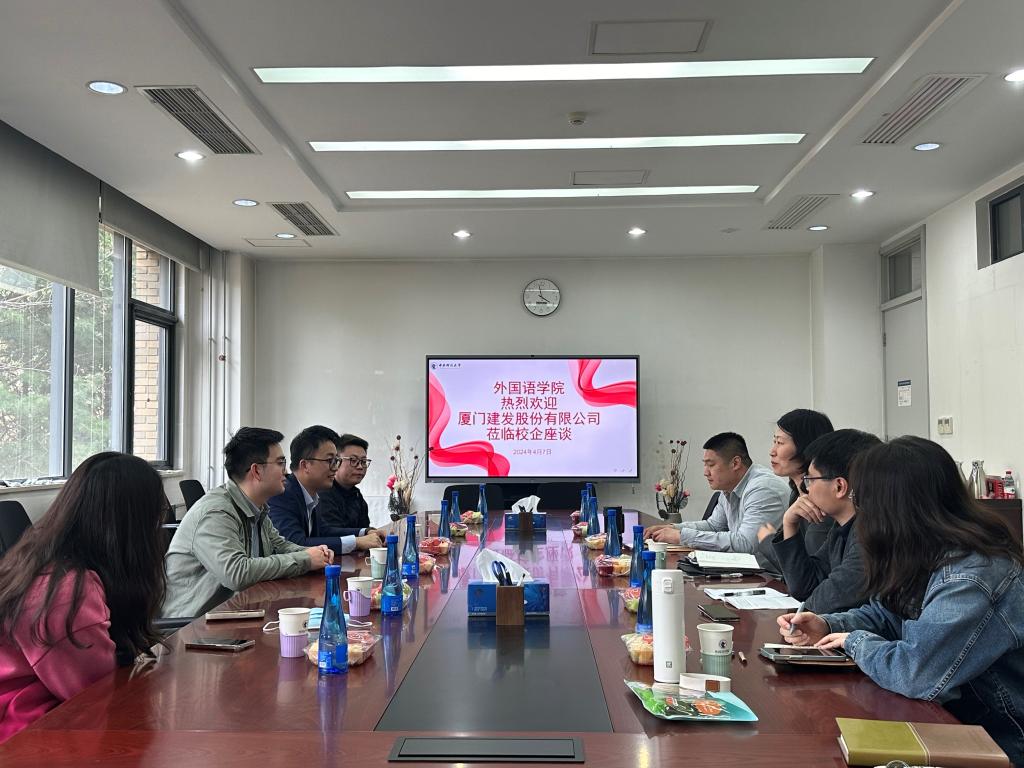 为进一步贯彻落实教育部和学校关于“访企拓岗促就业”工作部署,开拓学生就业渠道,加强校企合作,促进学生高质量就业,4月7日下午,外国语学院党委副书记王珊珊、学生工作办公室主任宋一民、团委书记齐芳欣、班主任代表胡健、魏爽在学院4号楼会议室接待建发股份人力资源部高级经理黄艺专、建发股份农产品集团人力行政副总经理吴泉、建发物流集团人事经理陈鹏婷、建发轻工有限公司招聘经理游紫茵、建发股份农产品集团胡书晨(外国语学院2023届校友)一行,并开展了校企交流座谈。