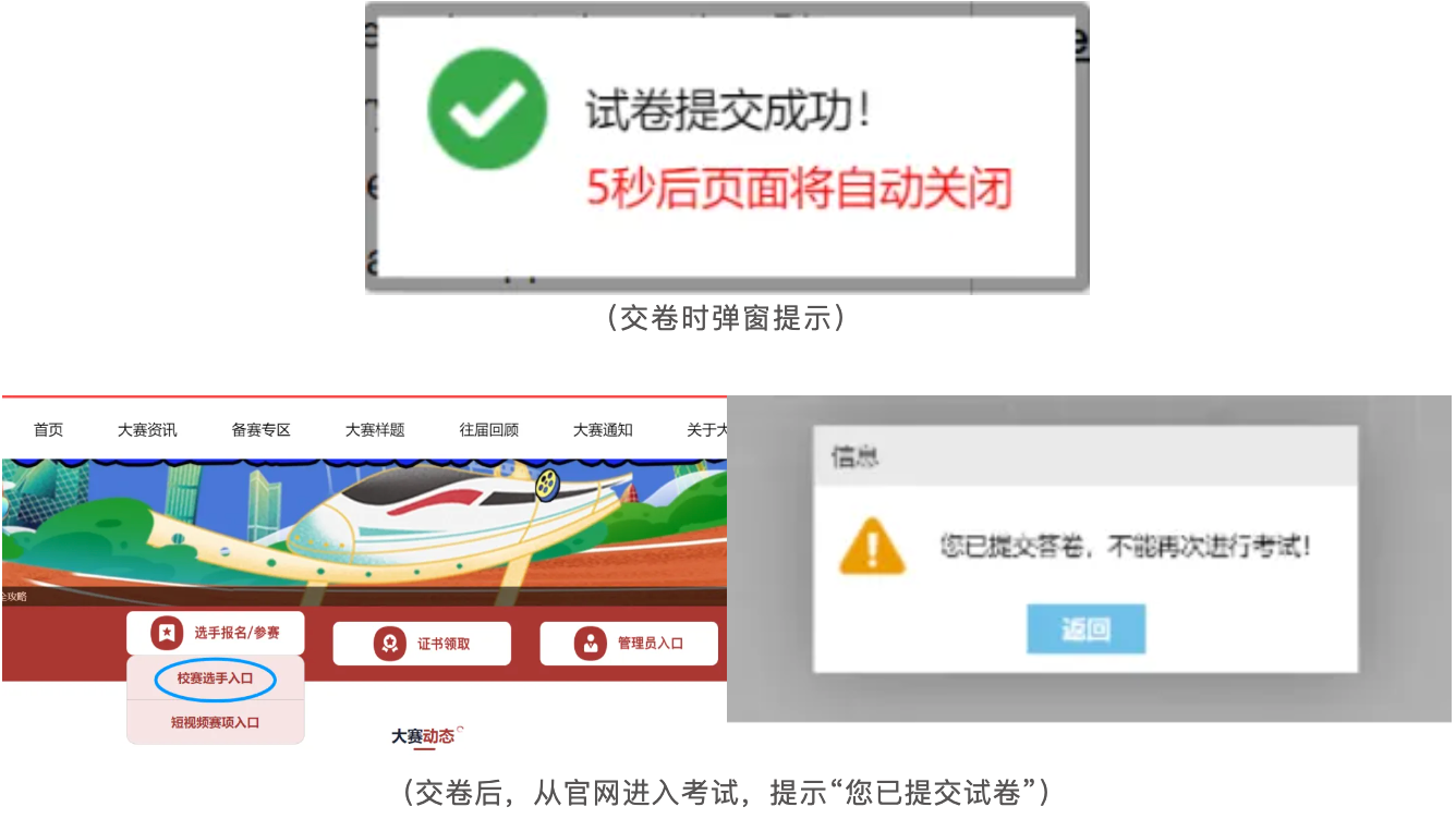 10. 提交试卷时会出现如下弹窗提示。试卷提交成功后,再次通过官网进入考试,会提示“您已提交答卷,不能再次进行考试!"