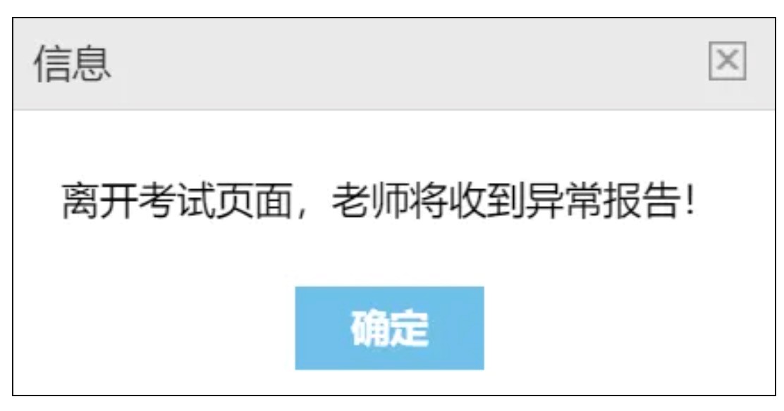 7.答题时,选手不可查看其他页面。如离开考试页面,切屏至其他页面,系统将弹出如下提示,点击”确定”继续作答即可。系统将记录选手切屏次数。