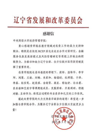 近日,辽宁省发展和改革委员会向我校发来感谢信,对我校政府管理学院负责完成的依托RCEP深化东北亚合作对策研究、金融服务住房发展新模式及风险管理研究等课题工作表示感谢。