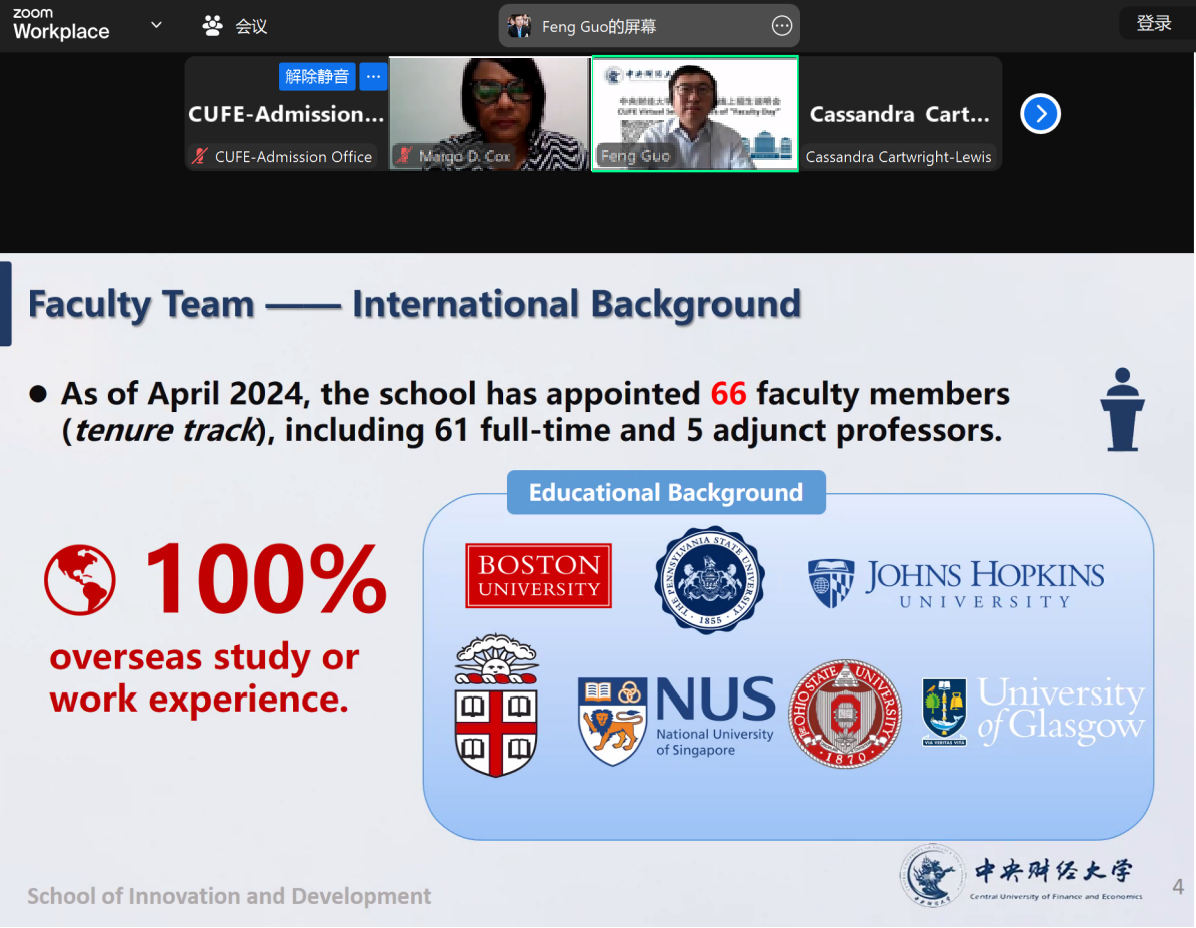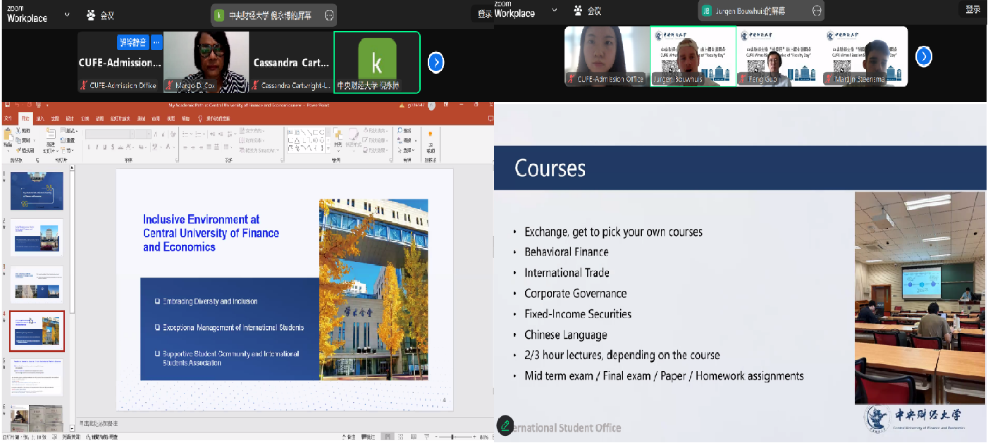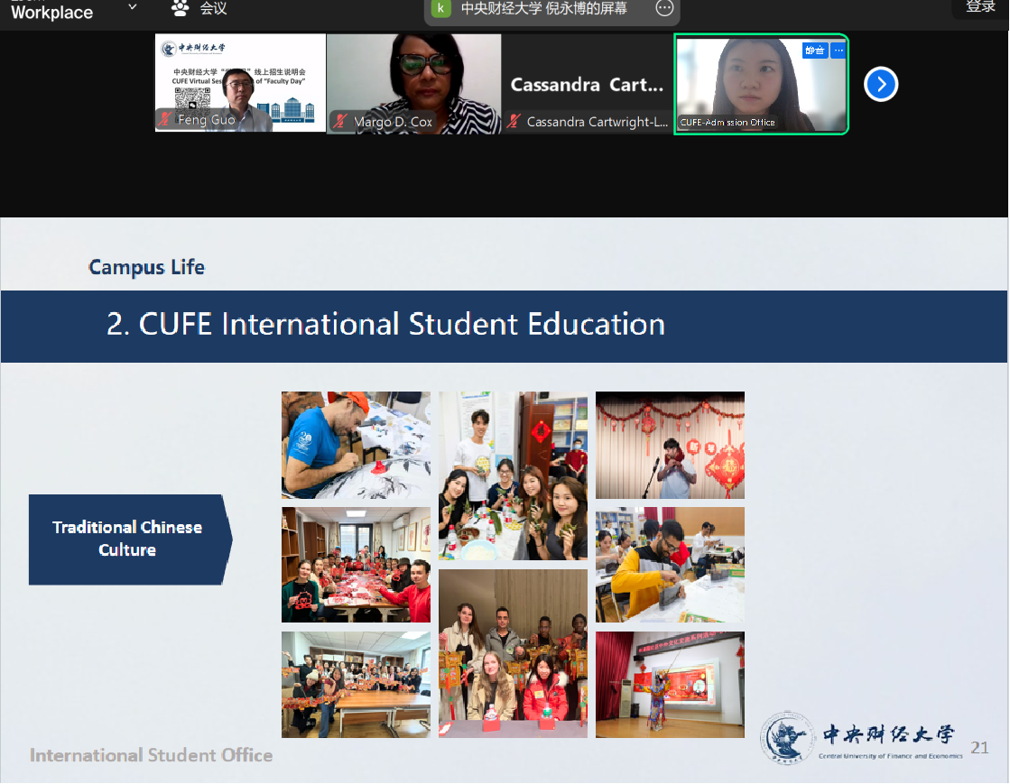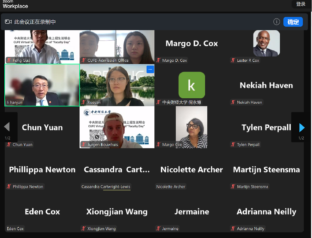 为落实习近平总书记关于“要打造更具国际竞争力的来华留学教育”的重要指示,5月21日上午,留学生工作办公室联合创新发展学院为巴哈马本地高二和高三学生带来了一场精心准备的线上招生宣讲会,隆重推出我校第一个金融学本科全英文项目。创新发展学院党委常务副书记李汉军、常务副院长袁淳、副院长汪雄剑、副教授郭枫、国际文化交流学院留学生招生办公室钱明才、李恬祎等参加会议。巴哈马驻华大使馆一等秘书Lester R Cox先生和Margo Cox女士以及北京霄申国际商务咨询有限公司执行董事李雪燕作为特约嘉宾参会。会议由Margo Cox女士主持。