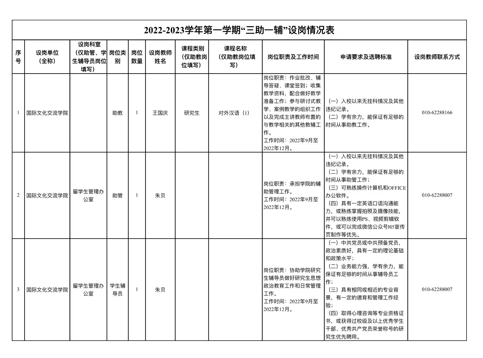国际文化交流学院2022-2023学年第一学期“三助一辅”设岗情况