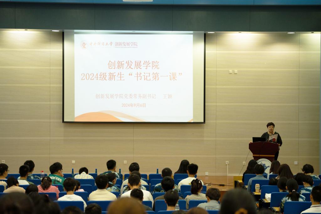 创新发展学院举办2024级新生入学教育书记院长“第一课” 为引导新生尽快适应大学学习生活,树立远大志向,坚定理想信念,坚定“四个自信”,2024年9月6日上午,我院党委常务副书记王颖以“立志、明志、笃志”为题,为2024级本科新生讲授“书记第一课”;常务副院长袁淳,以“勤思笃行,致广大而精微”为题讲授“院长第一课”。“书记第一课”讲座现场“院长第一课”讲座现场立志:志不立,则无可成之事。王颖书记强调当代青年要立志、明志。她指出,中央财经大学建校于1949年,为国而...