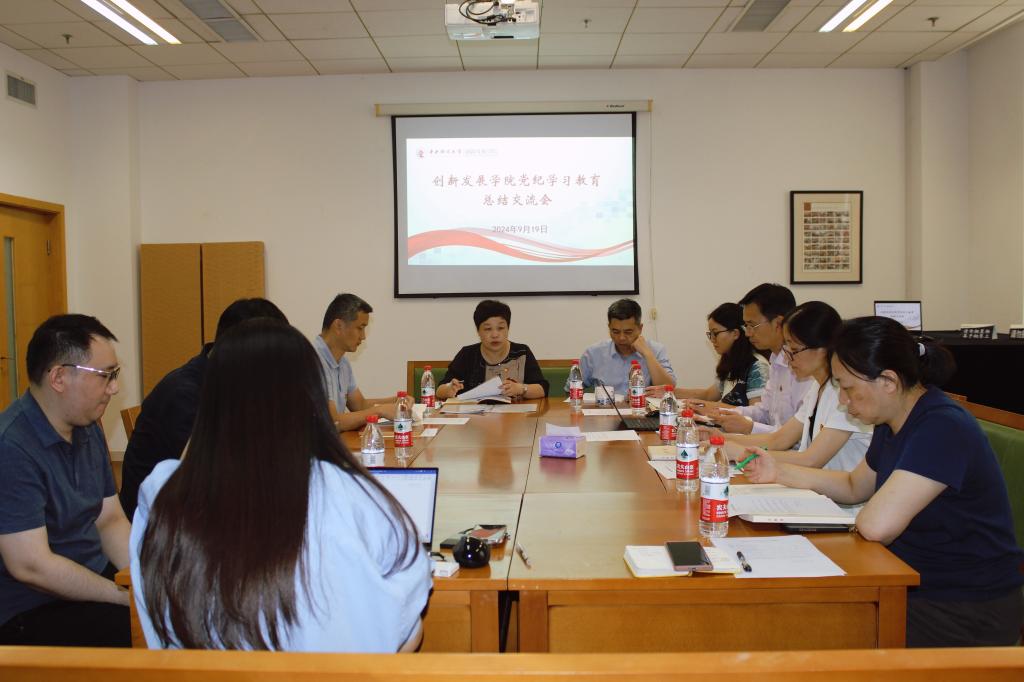 创新发展学院党委召开党纪学习教育总结会 9月19日下午,创新发展学院召开党委(扩大)会议,集中学习习近平总书记关于党纪学习教育的重要指示,全面总结学院党纪学习教育开展情况,研究部署推进党纪学习教育常态化长效化建设。学院党委常务副书记王颖主持会议,学院全体班子成员、党委委员、纪委委员参加会议。图1 会议现场学院党委常务副书记王颖指出,开展党纪学习教育是以习近平同志为核心的党中央作出的重大决策部署,是加强党的纪律建设、推动全面从严治党向纵深发...