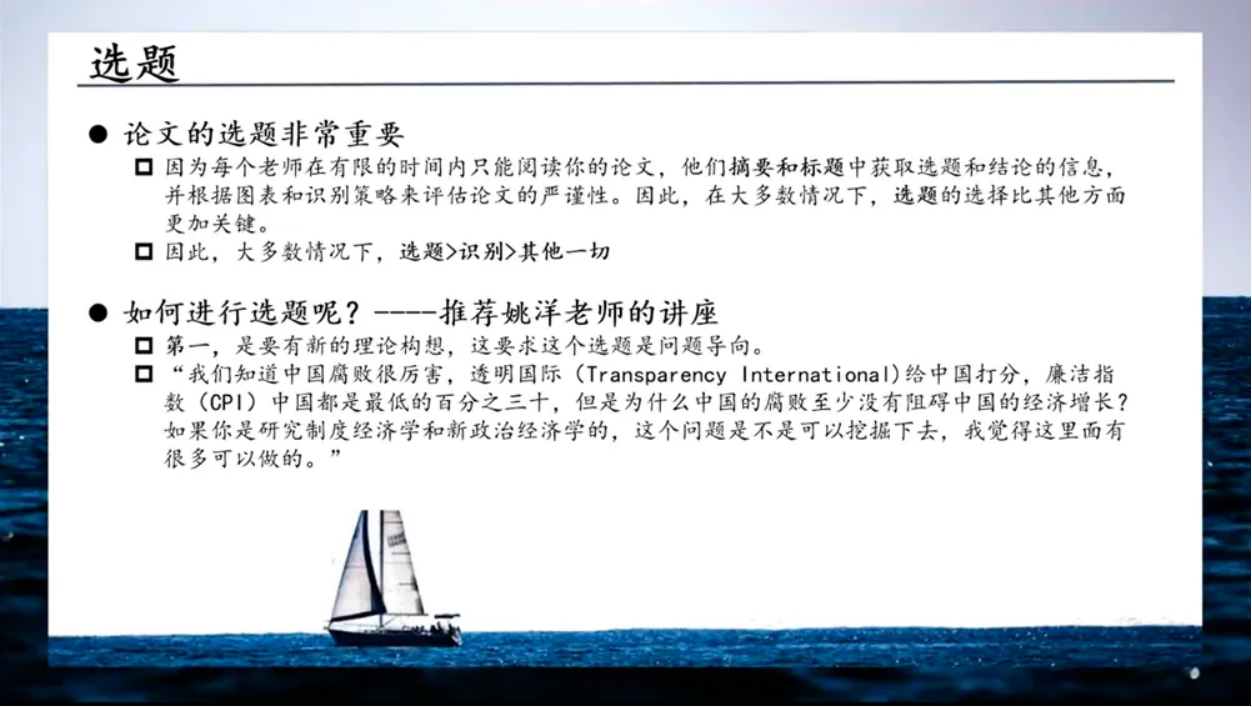 曾文锐从论文选题、论文写作及资源获取三方面分享经验。在选题方面,曾文锐建议可以从三个方面着手:一是阅读文献,了解当前的热门研究领域;二是关注一些未曾或很少被其他研究者使用的新数据;三是去尝试一些陌生的领域。在论文写作部分,他系统介绍了论文框架,并为同学们提供具体的范例。同时推荐了一些常用的学术网站,方便同学们学习参考。