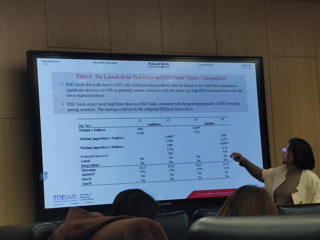 孙成竹助理教授首先指出了ESG投资基金存在的“言行不一”现象,然后讨论美国证券交易委员会成立的气候与ESG任务小组这一监管监督政策冲击对ESG基金“言行一致”的影响。孙成竹助理教授及其合作者发现任务小组的成立能够促进ESG标识基金投资于ESG表现更佳的公司,且这一效应受SEC监督程度及基金自身“言行不一”风险的影响。该研究表明监管监督在规范ESG标识基金的投资决策方面具有有效性。