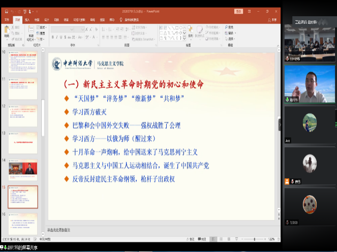 7月1日上午,学生工作部、学生处、武装部党支部,校团委党支部通过线上线下相结合的方式开展“学党史、悟初心、担使命”庆祝建党99周年联学活动。学习活动由马克思主义学院赵付科教授主讲,学生工作部、学生处、武装部党支部书记于晓明主持。
