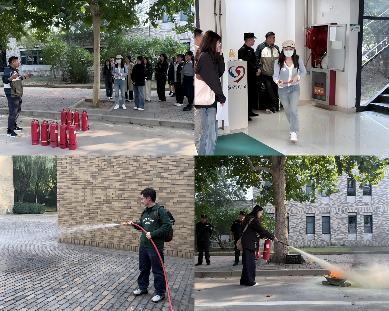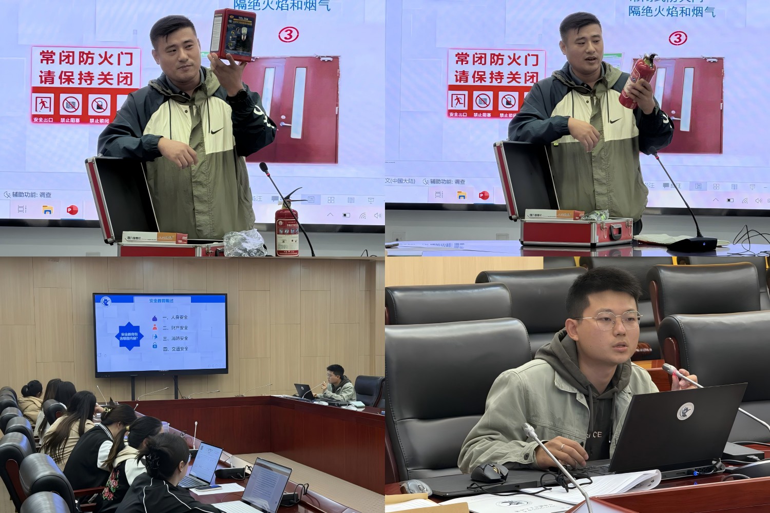 安全培训会环节,保卫处臧斌、俞鑫老师从人身安全、财产安全、交通安全和消防安全四个维度为住楼辅导员们进行了安全防范教育和安全知识技能培训,重点讲解了火灾预防知识、消防检查知识、防火灭火常识和火场逃生方法等,并现场演示了多种专业消防逃生工具的正确使用方法。实践环节中,住楼辅导员们亲身参与体验消防器材、安全逃生工具的使用,熟悉各类器材工具的操作流程。