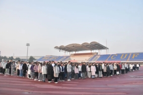 红日初升,晨曦微露。国旗护卫队的队员们迎着朝阳护送国旗入场,步履铿锵,口号响亮,展现了中财大学子昂扬向上的精神风貌。国歌响起,全体师生庄严肃立,心中对祖国的热爱与自豪油然而生。