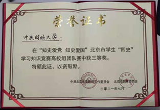 7月14日晚,“知史爱党 知史爱国”北京市学生“四史”学习知识竞赛总决赛暨颁奖典礼在东城区少年宫举行。北京市委教育工委、市教委有关领导出席活动,我校学生工作部部长于晓明参加颁奖典礼。在前期层层选拔和复赛后,中央财经大学、中国人民大学、中国人民公安大学、北京林业大学、北京化工大学、北京工业大学6支高校组代表队齐聚现场进行决赛,上演了一场精彩纷呈的党史知识大比拼。经过现场激烈角逐,我校马克思主义学院2020级硕士研究生王梅、王雪和彭畅三位同学组成的“小马奔腾”团队在总决赛中脱颖而出,斩获北京市三等奖。同时,我校还喜获本次知识竞赛优秀组织奖。