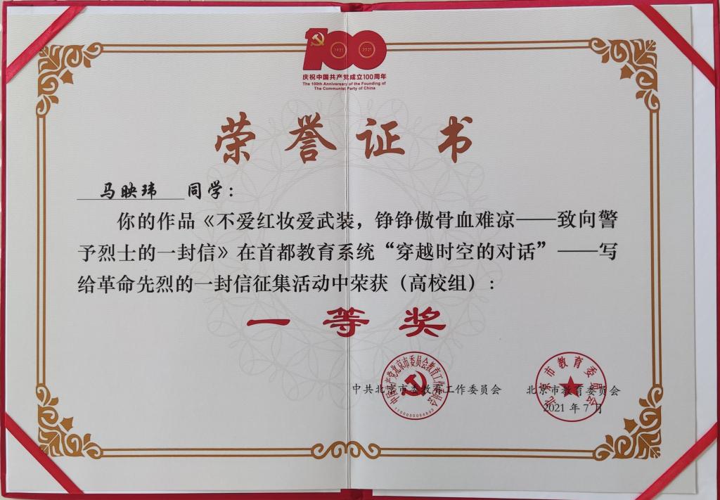 7月15日,由北京市委教育工委、市教委主办的“穿越时空的对话——写给革命先烈的一封信”征集活动颁奖典礼在清华大学附属中学举行。我校金融学院2019级本科生马映玮的作品《不爱红妆爱武装,铮铮傲骨血难凉——致向警予烈士的一封信》、会计学院2019级本科生郭田田的作品《永不消逝的电波——致李白的一封信》从1200余所学校1875篇入围优秀稿件中脱颖而出,分获高校组一等奖、三等奖。