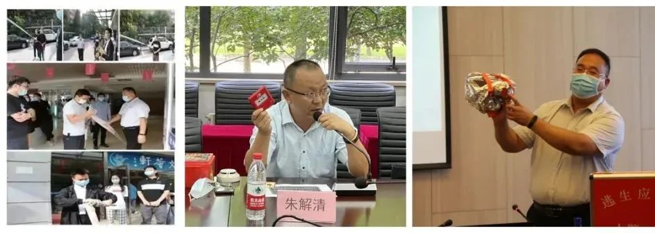 培训会环节,保卫处王其学、朱解清老师作为主讲嘉宾分别在两校区带来了一场生动深刻的安全防范教育和安全知识技能培训。理论教育环节中,两位老师深入浅出地讲解了火灾预防知识、消防检查知识、防火灭火常识和火场逃生方法等,并现场演示了防毒面具、消防手套、逃生绳、灭火毯、多功能消防手斧等多种专业消防逃生工具的正确使用方法。活动实践环节中,住楼辅导员们亲身参与体验消防器材、安全逃生工具的使用,并与主讲老师们积极互动交流。