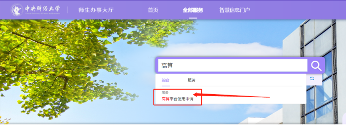 Ø 登录校园信息门户https://i.cufe.edu.cn,系统直通车栏目依次进入办事大厅--->全部服务