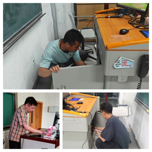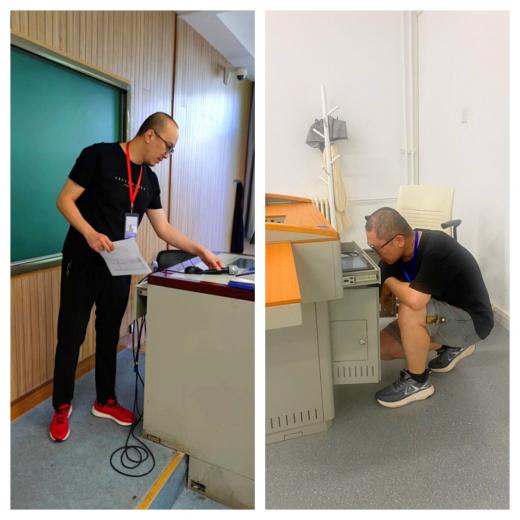 教室会议室技术科全体工作人员早在5月初便在分管领导周涛老师的带领下对本次四、六级英语放音工作进行了周密计划并制订了详细方案。科室全体同事分工协作,对学院南路60间教室,沙河校区108间教室进行逐间测试。为了不影响师生上课,科室人员利用短暂的午休时间进行检测,为了模拟真实的考场环境,确保考生在考试过程中能够身临其境地感受到放音材料的播放效果,科室全体人员于考前进行真实演练,加班至深夜。在检测过程中,团队人员提前进行多次设备检测和调试,仔细检查设备的各项功能,确保音质清晰、音量适中、无杂音干扰。为了确保听力播放的顺利进行,还制定了详细的应急预案,以应对可能出现的突发情况。