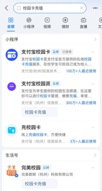 1、打开手机支付宝APP,在最上面搜索框内输入“校园卡充值”进行
