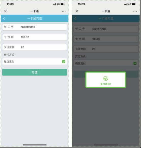 3、学工号和卡余额是自动获取的,输入充值金额,点击“充值”按钮,出现“支付成功”对话框时,微信充值操作完成。