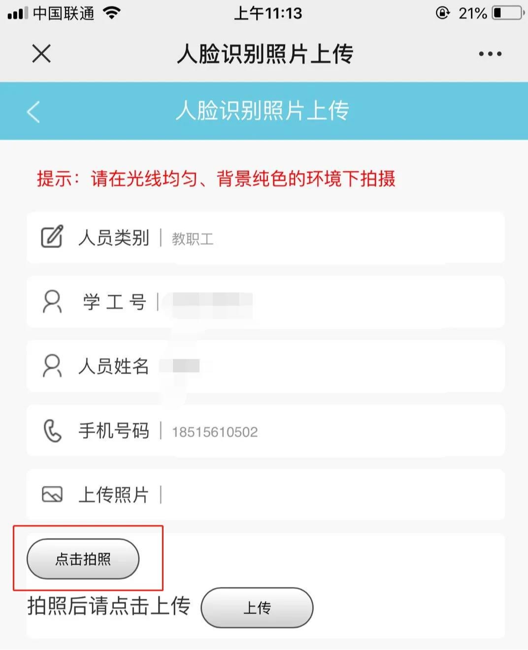 3.点击拍照,为提高识别率,拍照时请将头发梳理至耳后,摘掉眼镜和帽子,正面拍照,照片中人脸像素不低于200*200,拍照背景颜色单一,请勿使用证件照或者美颜照片,不能用手机直接拍摄原有照片,避免强光和黑暗环境中采集。