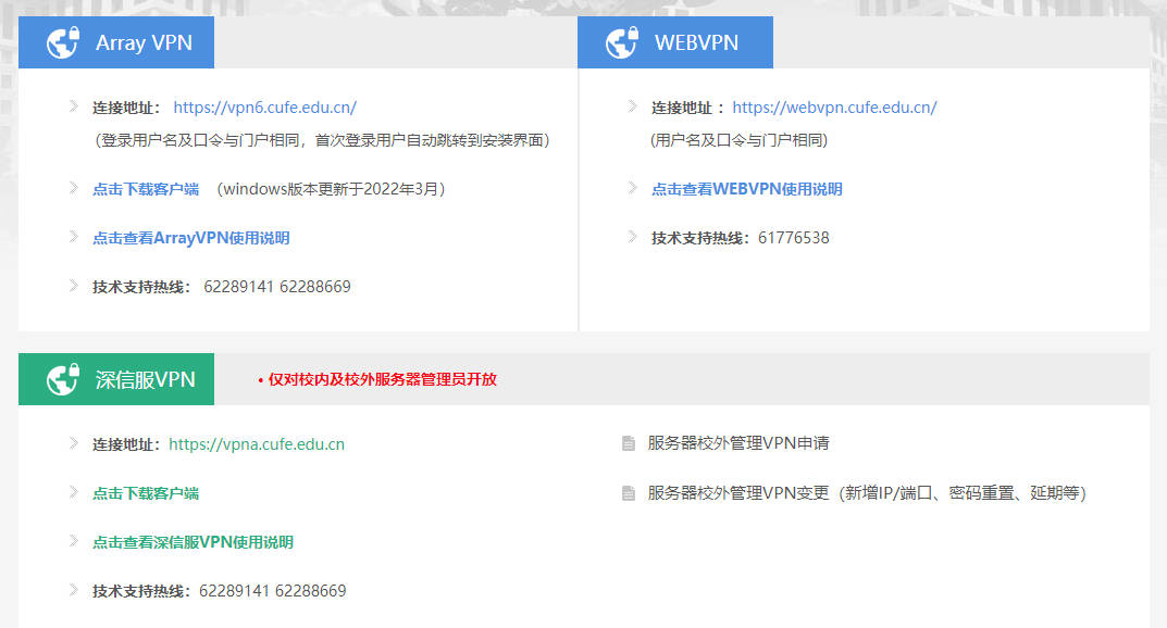 中央财经大学VPN服务系统是为方便师生从校外访问校内特定资源提供的虚拟专用网络服务,包括ArrayVPN、WEBVPN,其中Array支持包括IOS在内的移动端的VPN服务。