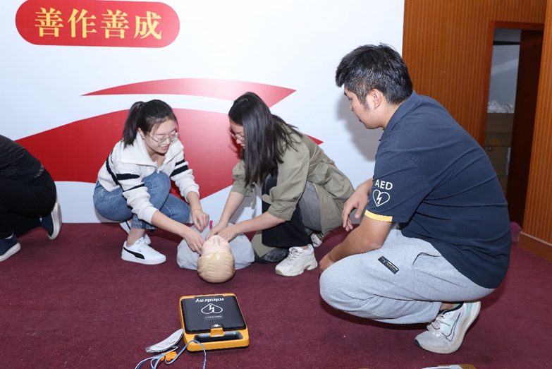 培训中,AED生产厂家迈瑞公司培训师陈广福通过图文讲解、现场实操等,围绕急救实施步骤、胸外按压要点、常见的胸外按压错误方式、人工呼吸要点及AED自动体外除颤器操作等急救知识进行了系统的讲解,并操作演示了急救动作要领。